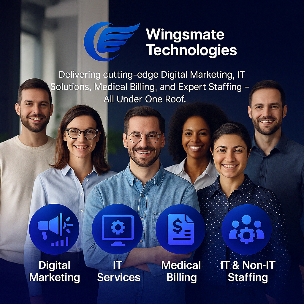 Wingsmate Technologies is your trusted partner for smart business solutions. We specialize in Digital Marketing, IT Services, Medical Billing, and IT & Non-IT Staffing. With a focus on innovation and efficiency, we help businesses grow, scale, and succeed in the digital age